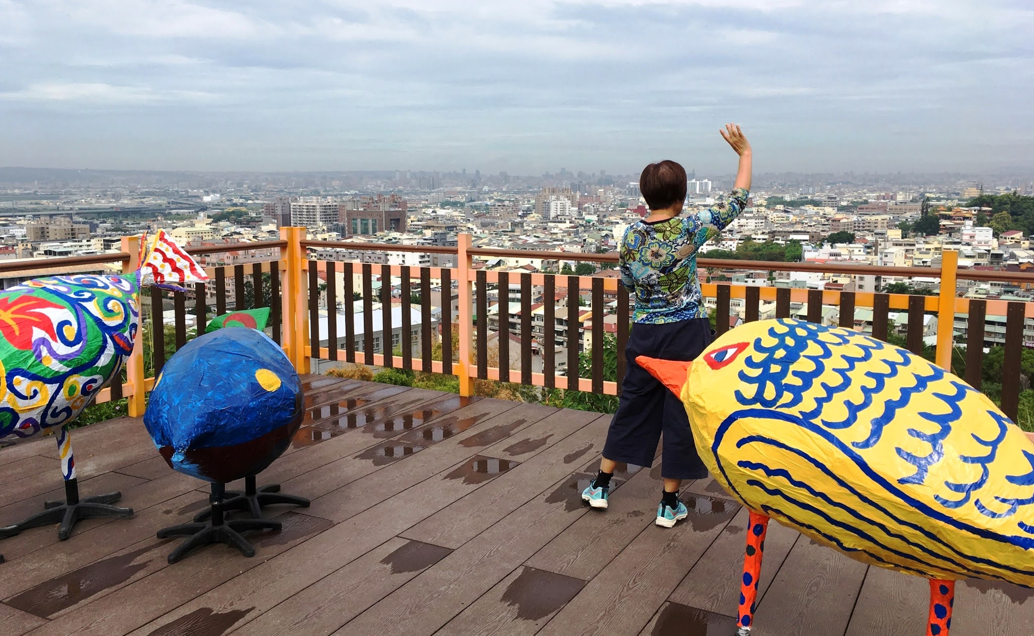 It was a brief, unexpected rehearsal for this evening's performance at Zhongshan Tang (中山堂) in Taichung. When Jean and I walked up the Moon-Watching Hill, we found that nobody else was there on the viewing platform (or observation deck). Immediately Jean started singing He Xin Lang (賀新郎, a Song lyric written by Xin Qiji 辛棄疾). Jean sang it in the so-called Classical Taiwanese: